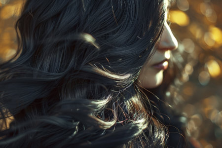 A woman with long brown hair is shown with a lot of light and shadow. The hair is wavy and has a lot of texture, giving it a natural and organic appearance. Scene is one of warmth and beauty