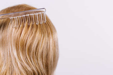 Hair care. Darsonval in comb shape and female blonde girl hair. Background with side space for text or advertising.
