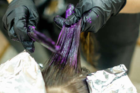 Dyeing a strand of purple hair. Hairdressing services in the salon.