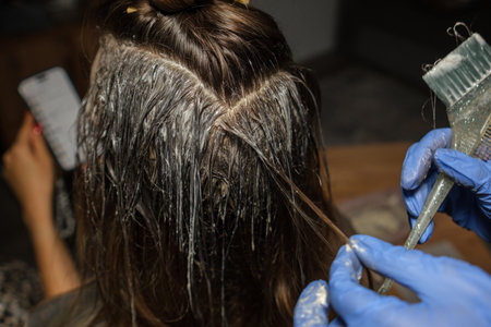 Stylist carefully applies hair color to sections, utilizing gloves and tools while client reviews color options on the phone.