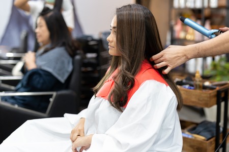 Mixed race teenage in hair salon get new hairstyle with straighteners and curl.