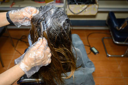 Hairdresser salon. Hair colouring in process. Woman dyeing hairs.