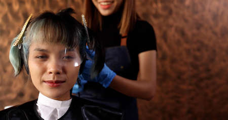 Professional Asian hairdresser dyeing hair of her client at beauty salon shop