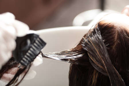 A hairdresser dyeing a hair to women by black brush. Brunet changing a hair color.