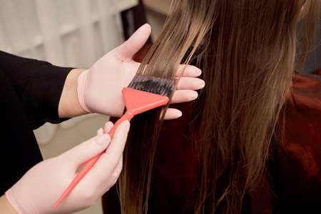 Hairdresser dyes hair in a professional salon. close-up of hands