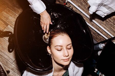 Hairdresser in beauty salon washes his client hair, before procedure of applying natural restoring ingredients and vitamins to hair and haircut.