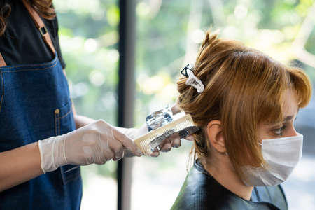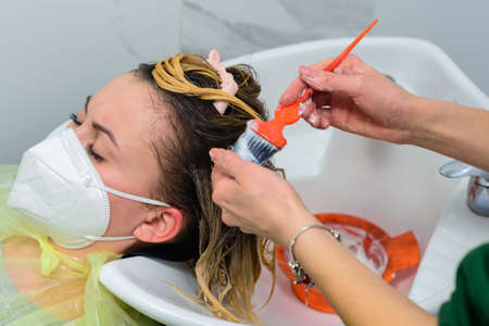 Adult woman at hairdresser wearing protective mask due to coronavirus pandemic