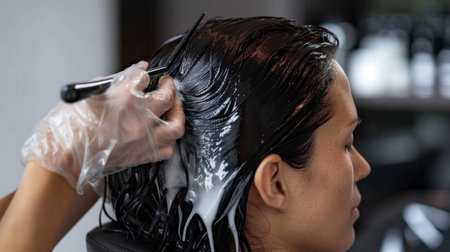 Stylist at sleek salon pampers hair with nourishing treatment application. Concept Hair Styling, Nourishing Treatment, Salon Pampering, Sleek Style, Stylist Services