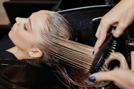 hair stylist washing hair of yong blonde girl in hair salon before haircut