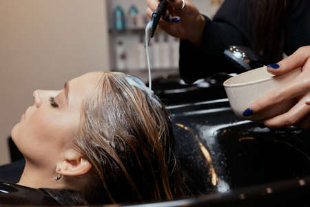 Applying conditioner after shampoo, hair care in the salon, balayage technique. new