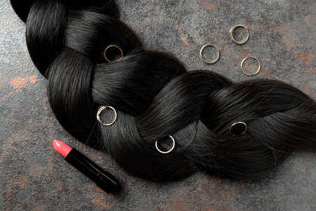 A lock of female hair with rings and lipstick