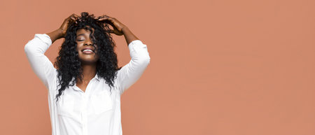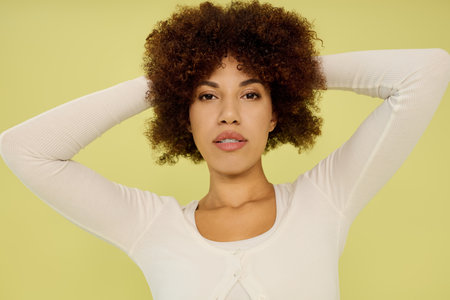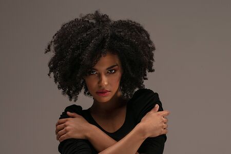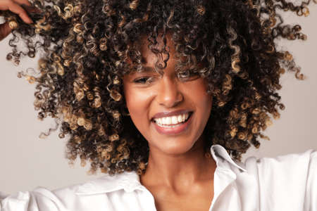 Beautiful African American woman touching her curly hairs