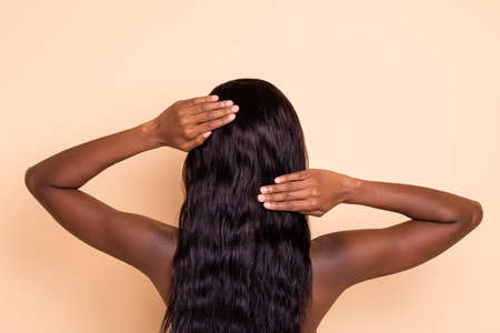 Back photo of flawless charming young brunette lady hands touch long straight healthy hair isolated beige background