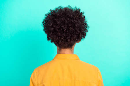 Photo portrait back view woman with black curly hairstyle isolated vivid teal color background