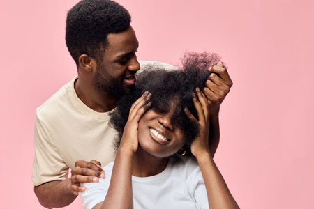 Joyful couple sharing moments together with natural hairstyles against a pink background, celebrating love and togetherness with happiness