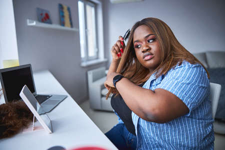 Serious lady combing her hair in front of mirror
