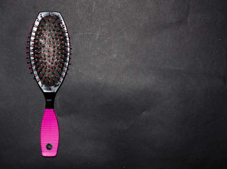 Dirty hair brush, Grey lint dead skin cell residue on unclean comb, Poor hygiene head scalp, Hair fall problem.