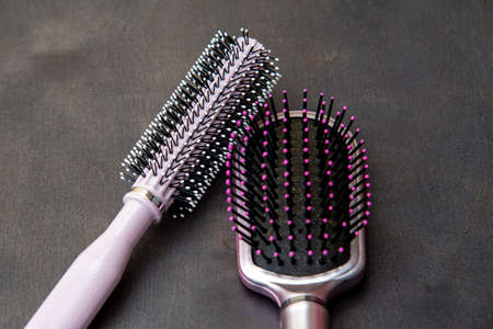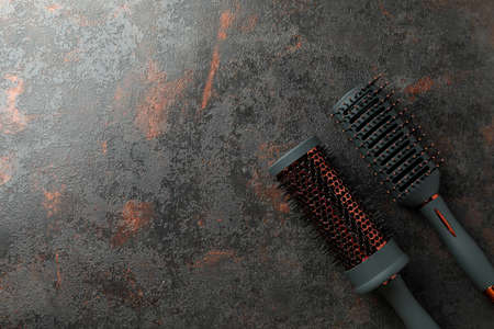 Hair tools, beauty and hairdressing concept - different brushes or combs on beige background. Top view