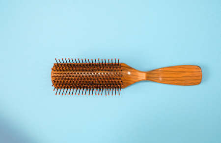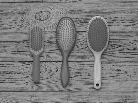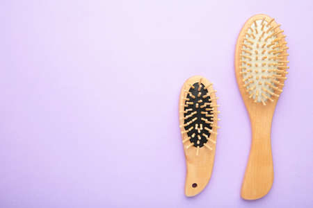 A set of massage combs on a wooden background. Accessories for hair care. flat lay.