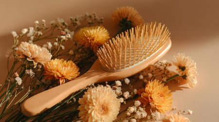 Elegant wooden hairbrush surrounded by vibrant flowers on a soft beige background