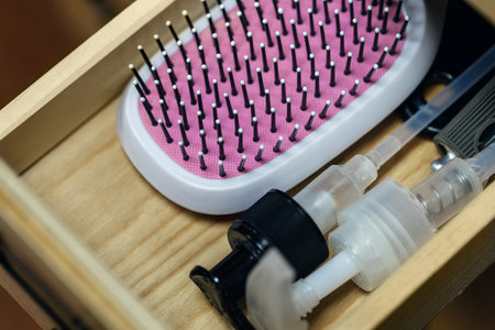 Professional pink massage comb and sprayers in the hairdressers drawer, close-up.