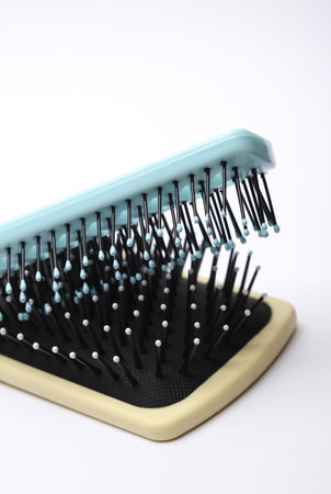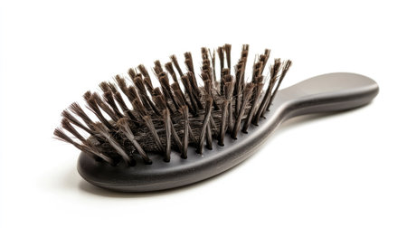 A hairbrush with hair loss visible on the bristles, isolated on a clean white background, showing the effects of thinning hair.