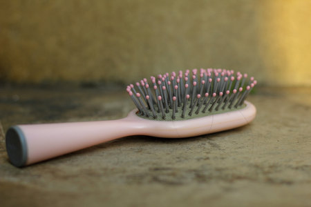 Pink hairbrush on cement floor background, selective focus and vintage tone