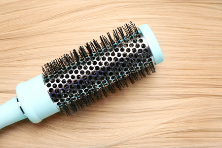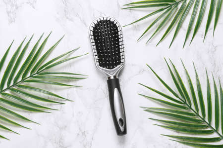 Hairstyle concept with hair brush on yellow background. Fashion, beauty and hygiene. Plastic comb for salon and home usage