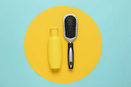 Minimalistic beauty concept. Hair care. Comb and bottle of shampoo on yellow background with yellow circle.
