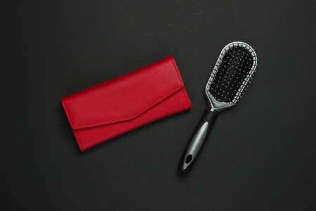 Women's accessories on a black background. Comb, leather red purse. Top view
