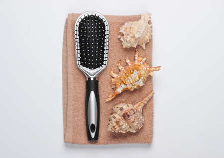 Beauty products. Seashells, towel, hairbrush on white background. Top view. Flat lay
