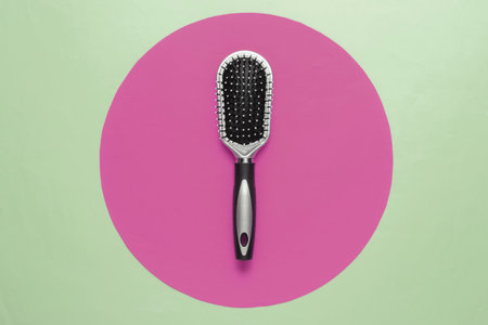Stylish hairbrush on green background with pink circle. Women's Hair Care Accessories.
