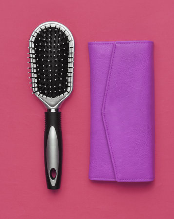 Fashionable women's accessories. Leather wallet, comb pink background. Top view
