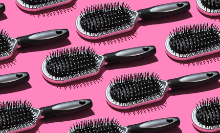 Hair Care Concept. Beauty pop art background. A lot of hairbrushes on pink background.