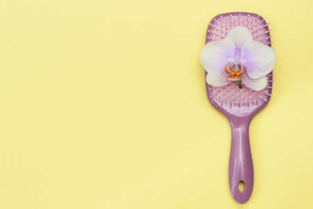 Massage hair brush with orchid flower on yellow background, flat lay, copy space.