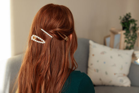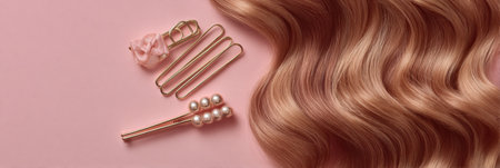 Wavy hair casually arranged on a soft table surface complemented by various decorative clips and accessories creates an appealing beauty flatlay.