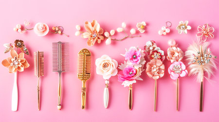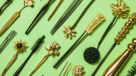 A colorful collection of hair accessories including combs, pins, and decorative elements arranged neatly on a bright green background showcasing style and elegance.