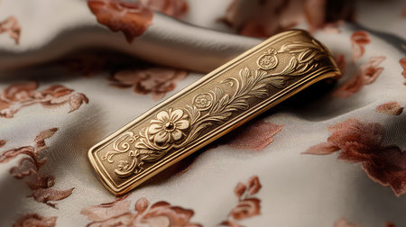 This stunning vintage golden hair clip features an intricate floral design beautifully set against soft satin fabric. Perfect for elegant hairstyles.