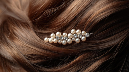 Close-up view of an elegant hair accessory featuring pearls and crystals, beautifully nestled in flowing brown hair, perfect for beauty and fashion themes.