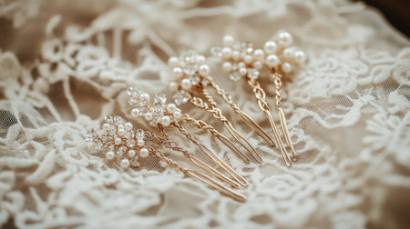 This image showcases elegant hair accessories adorned with pearls resting on a delicate lace background, perfect for bridal or formal occasions.