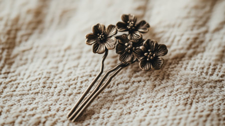 This image features a vintage hairpin with intricate flower design, set against a softly textured fabric background. Perfect for fashion and accessory themes.