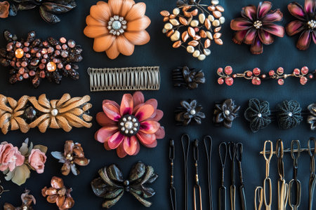 A collection of decorative hair accessories including flowers and clips displayed on a dark background