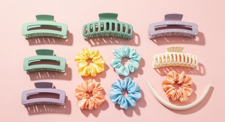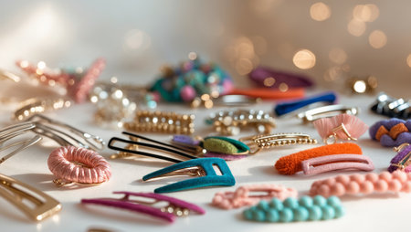 Colorful collection of various hair accessories displayed on a surface with soft lighting