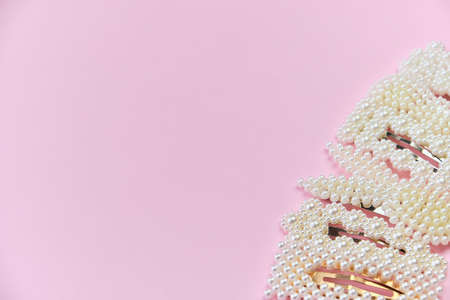 Pearl hair clips. fashionable hair accessories. Set of Hairpins different shapes with white pearls on Pink background with copy space