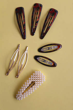 Colorful trendy hair clips on bright yellow background. Selective focus.