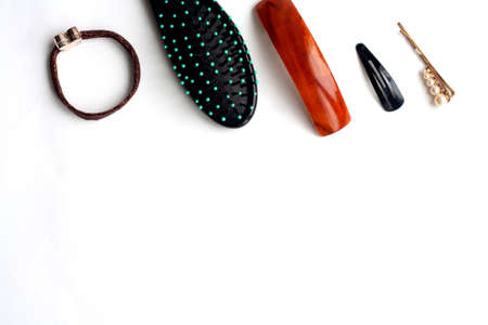 Hair supplies comb and accessories on a white background flat lay copy space