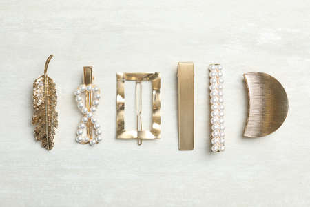 Beautiful different hair clips on white table, flat lay