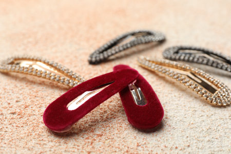 Different hair clips on color textured table, closeup