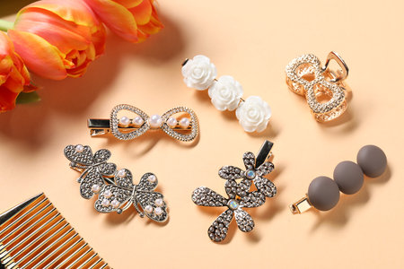 A flat lay of different types of hair clips, including decorative barrettes, bobby pins, and snap clips, displayed on a stylish background for a fashion-forward look.