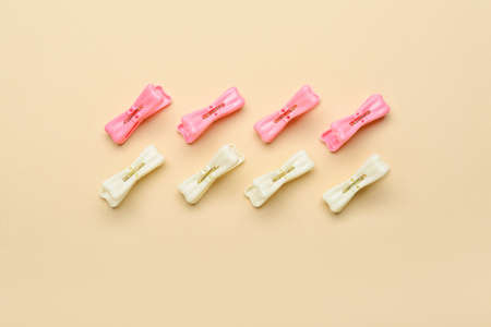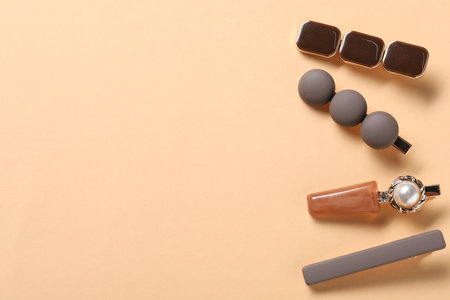 Beautiful hair clips on beige background, flat lay. Space for text